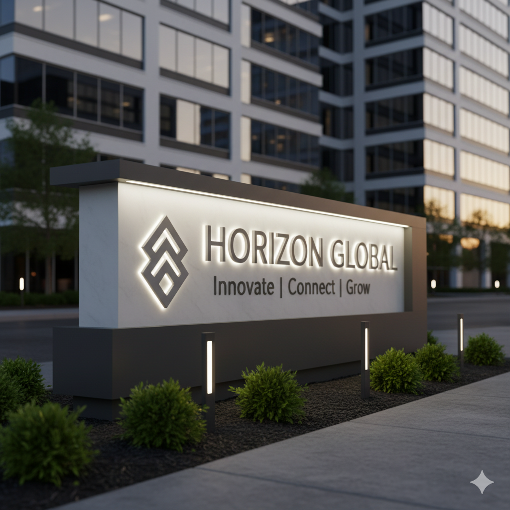 A sleek, illuminated channel letter sign for HORIZON GLOBAL. This professional installation embodies their brand message of innovation and growth, making a powerful corporate statement day and night.